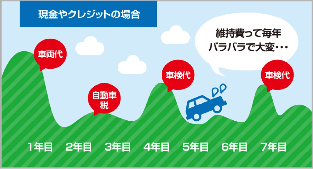 ローンには含まれない、未来の必要経費(オイル交換、車検など)を含めて分割払いができます